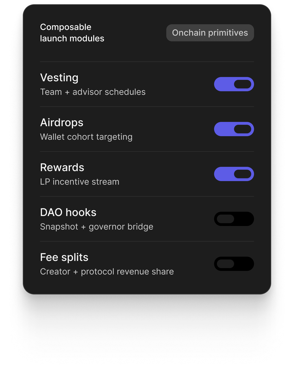 Easily define and launch any tokenized asset without restrictions. Whether it's memecoins, RWAs, or protocol tokens, you have complete control.