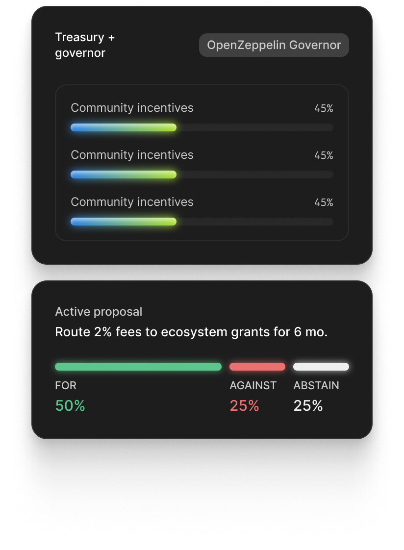 Integrate OpenZeppelin Governor treasuries to empower communities with shared ownership and governance.